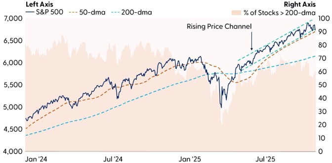 By Friday, however, buy-the-dip sentiment had resurfaced as investors stepped in at key technical support. The S&P 500 survived another retest of its 50-day moving average (dma), which coincidentally overlaps with the lower end of its rising price channel. A break below this channel would expose downside risk toward the November and October lows (6,631 and 6,550, respectively).