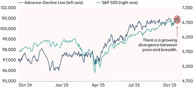 In sum, the macro backdrop is evolving: monetary policy is less predictable, trade risks are easing, and earnings are surprising to the upside. But concentrated leadership and structural cracks in market breadth suggest a more selective and tactical approach may be warranted heading into year-end.