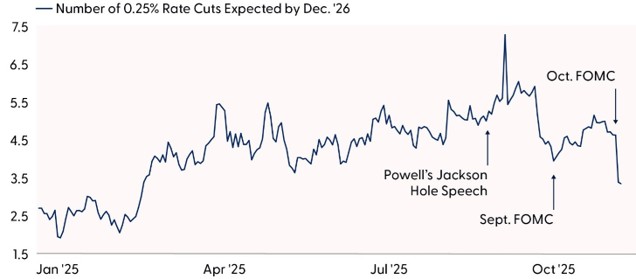 As widely expected, the Federal Reserve (Fed) cut interest rates by 0.25% at its October Federal Open Market Committee (FOMC) meeting last week. Similar to last month, the accompanying policy statement noted that economic activity has been expanding at a moderate pace, and the unemployment rate has remained low, despite rising downside risks to the labor market. With limited economic data available due to the ongoing government shutdown (outside of private sector data), there were few surprises in the press release. Recently appointed Fed Governor Stephen Miran dissented again, favoring a 0.50% interest rate cut, while Fed Governor Jeffrey Schmid preferred no change to the target range this month — a new dissenter since the September FOMC meeting (he voted in favor of a 0.25% cut last month). With its conflicting dissents, the Fed decision is reminiscent of September 2019, when the Committee cut rates, but some wanted a more aggressive cut, while others preferred no change at all.